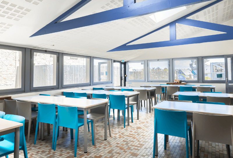 Un nouveau bâtiment entièrement rénové propose 39 lits répartis en chambre de 1 à 5 personnes dont 6 chambres avec salles d’eau privatives. Les différents espaces sont composés de 3 salles d’activités, 1 salon bibliothèque, 2 salles à manger d’une capacité de 40 et 60 places.